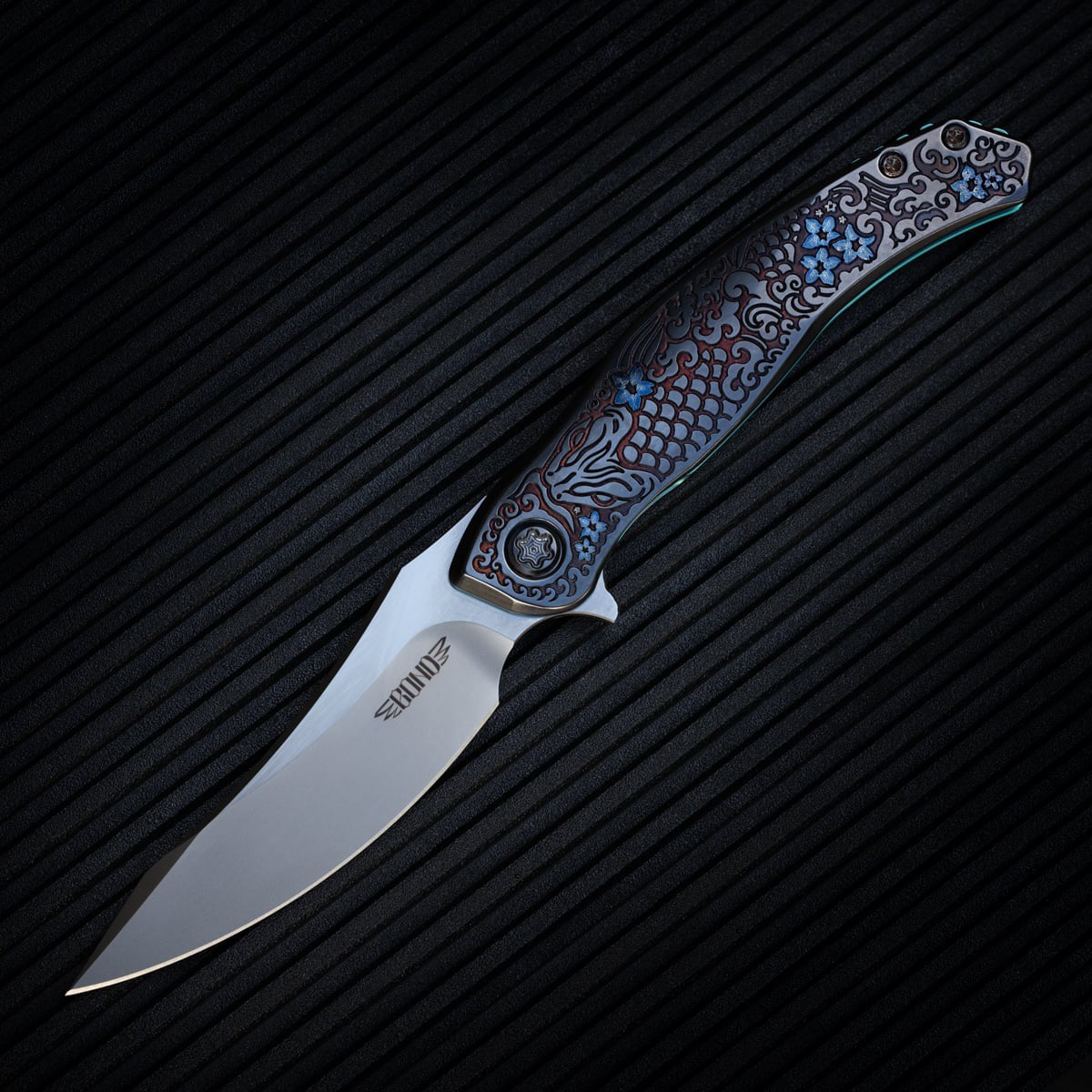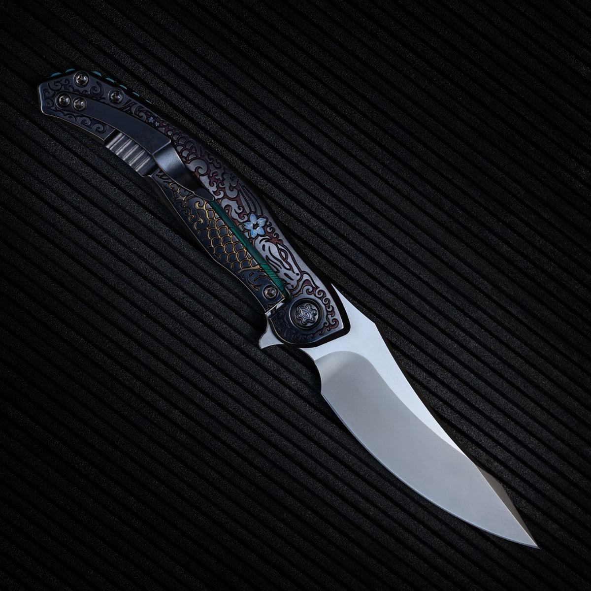 Titanium handles featuring laser engraved Koi / Sakura artwork, micro-blasted bevels and hand satin flats. Handles have been given a laser colored treatment for improved wear resistance.